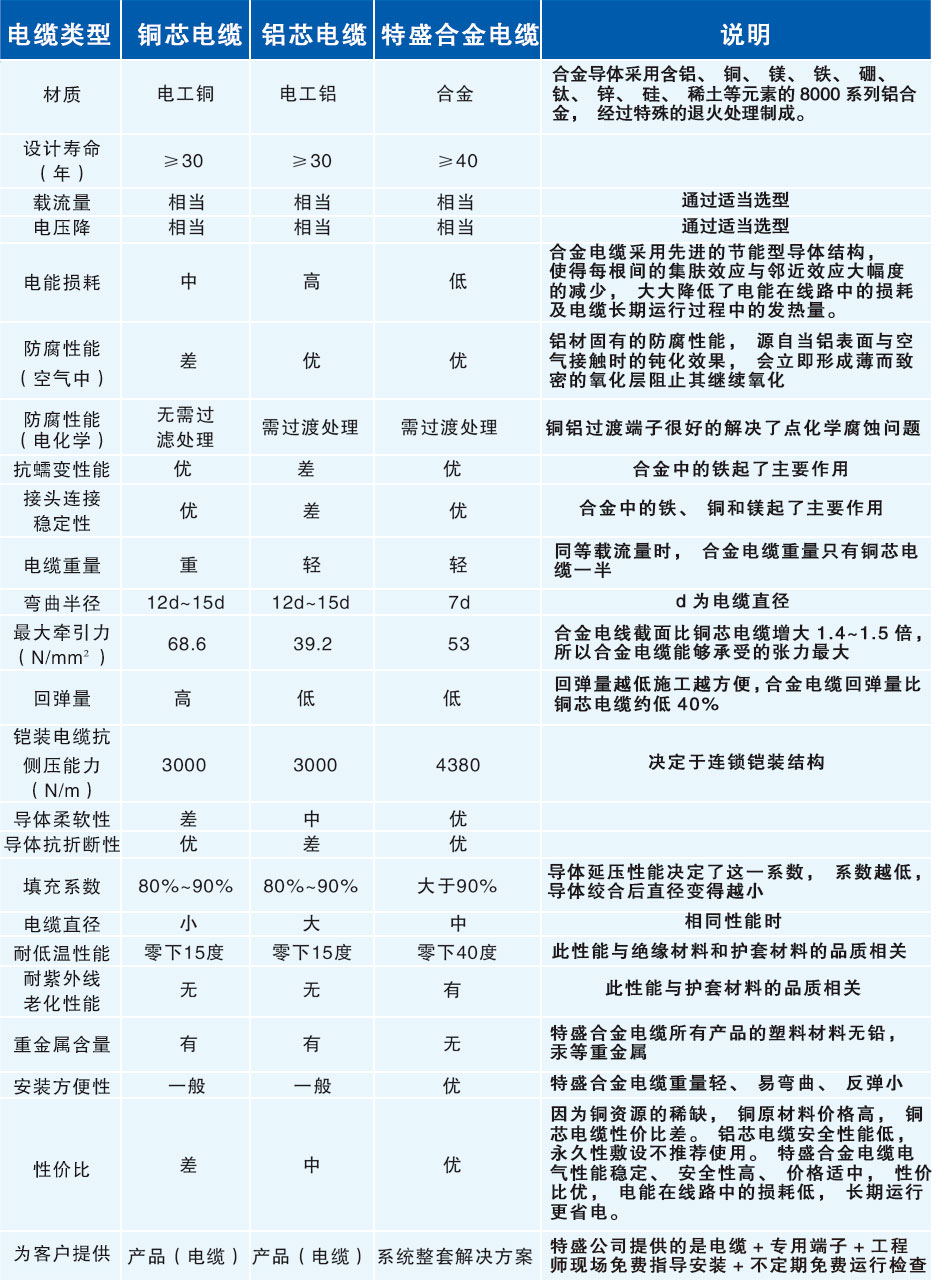 鋁合金芯電力電纜與銅或鋁芯電力電纜性能對(duì)比表